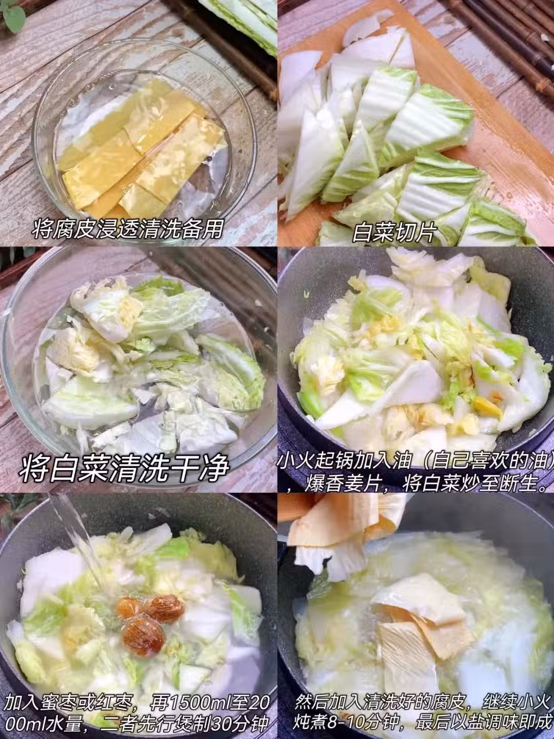 滋陰潤燥:腐皮補虛,白菜補水,緩解乾燥。 健脾益胃:棗搭配白菜,開胃且助消化。 補充營養:提供多種營養,增強免疫力。 清熱除煩:借白菜寒涼,去燥熱、解心煩 。