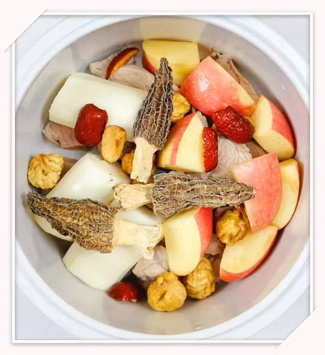 🧂食材:豬肉500g、蘋果1個、淮山300g、羊肚菌6個、紅棗5個、無花果6個、姜1片