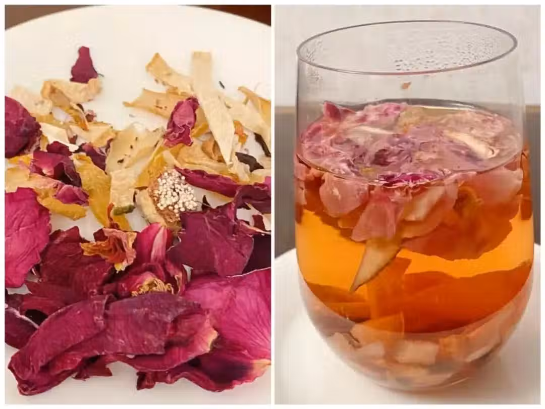 1、準備一個乾淨的瓷杯或玻璃杯,將玫瑰花和佛手分別放入杯中。