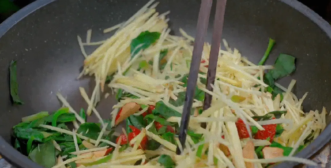 炒至車前草和薑絲大約八成干時,加入之前炒好的小米,繼續翻炒均勻,直至所有材料都變得非常乾燥,散發出混合的香氣。