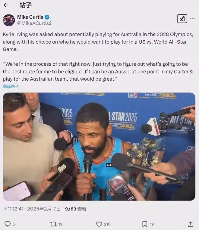 全明星正賽結束之後,歐文接受採訪時,公開說道:「我正在處理為澳大利亞出戰的手續,在努力弄清楚讓我有資格參賽的最佳途徑。這涉及到很多工作,也需要美國男籃這邊做決定。對我來說,能為澳大利亞男籃效力,那就太棒了。」