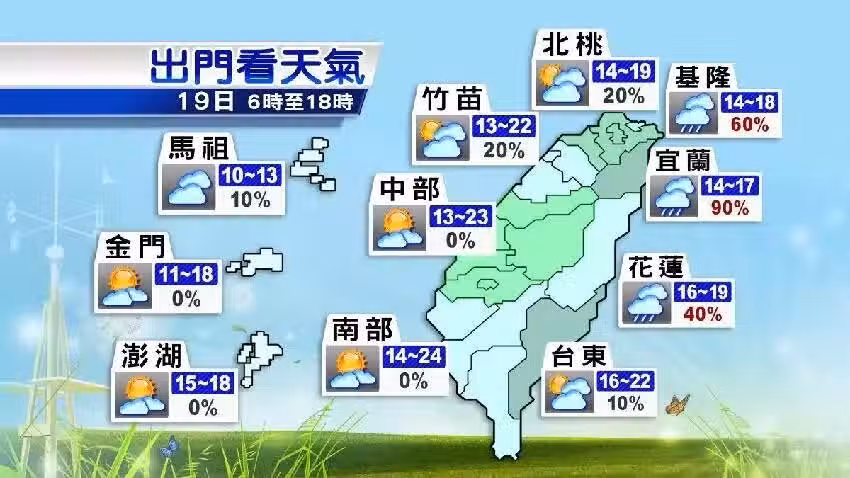 今天(19日)清晨仍受大陸冷氣團影響,各地天氣偏冷,中央氣象署表示,台南以北及宜蘭低溫13、14度,其他地區約15、16度,白天開始冷氣團減弱,各地氣溫稍回升,桃園以北及宜蘭、花蓮高溫17至19度,感受仍較涼,其他地區約22至24度。