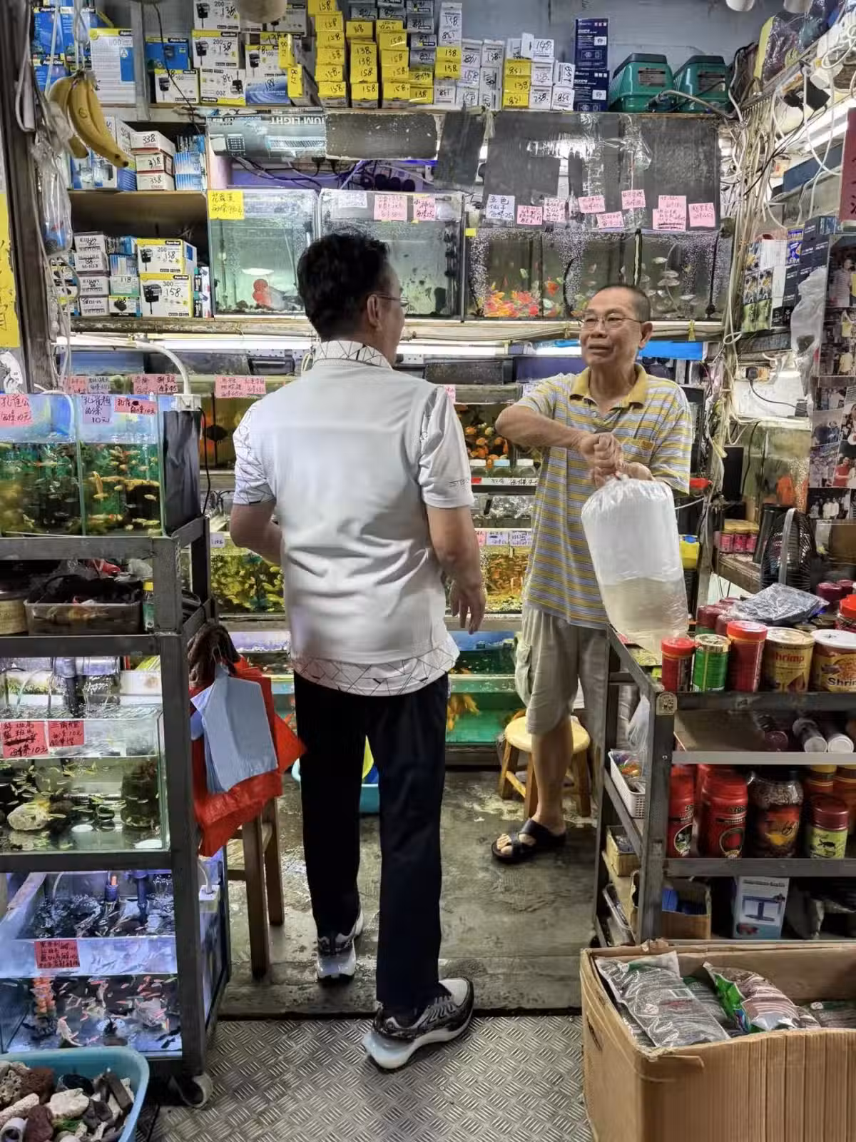 74歲譚詠麟到街邊小店,買了幾條金魚,不擺架子,和店主友好交談