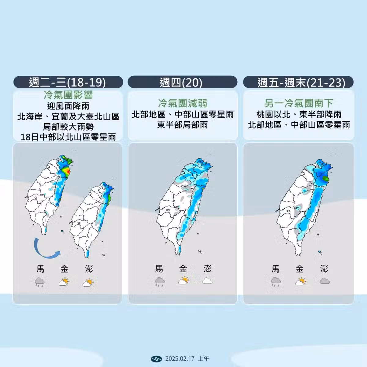 預報顯示,周六的降雨主要集中在北海岸、基隆、大台北東側、東北角及宜蘭等地區,花東地區也有零星降雨機會。到了周日,降雨範圍將縮小至桃園以北及宜蘭地區,午後則是台中山區和花東山區有零星降雨機率。