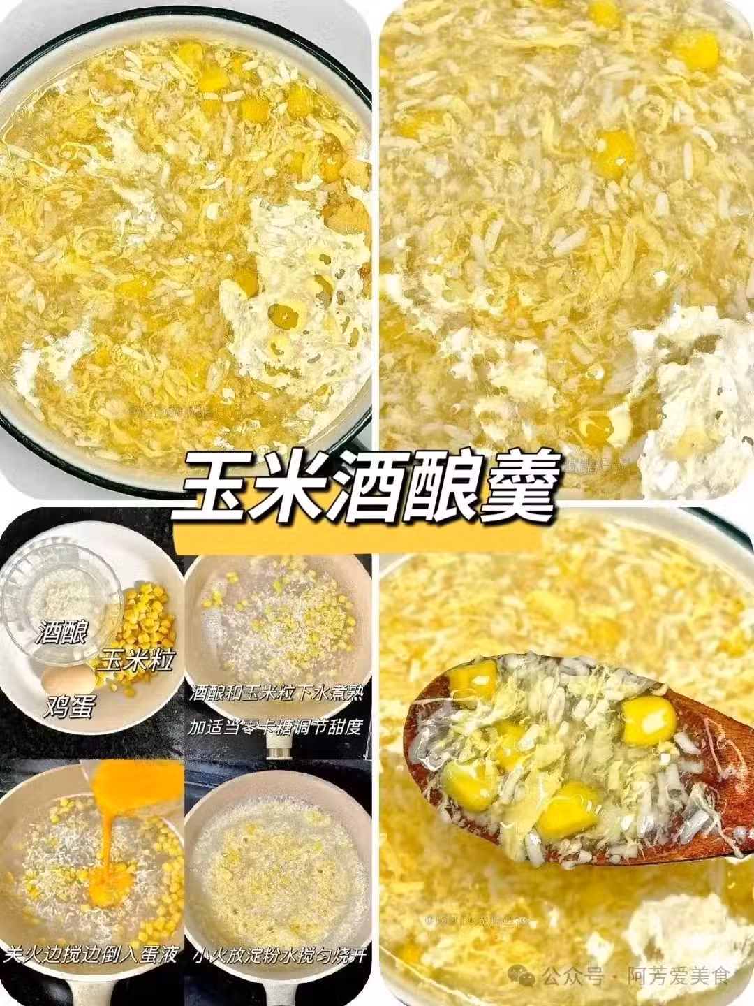 玉米酒釀羹,香甜多汁的玉米和酒釀一起煮,非常的驚艷,再加入雞蛋不僅豐富了一整碗的口感,還非常的香,當早餐也合適。