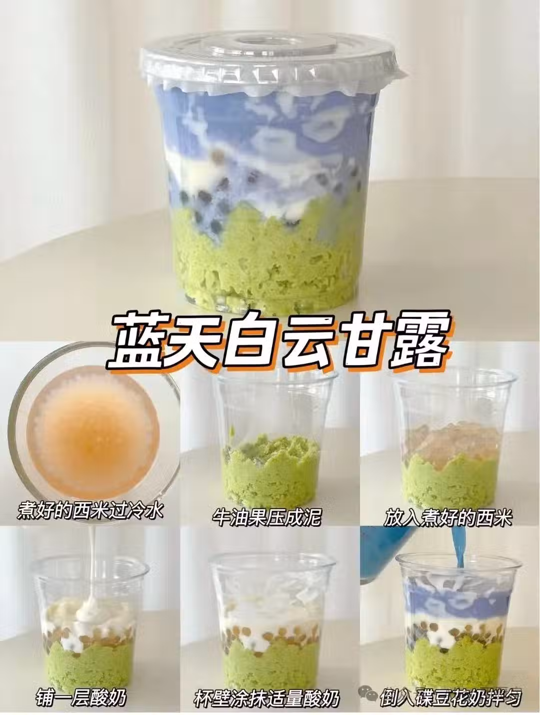 組裝飲品:在杯底放入牛油果泥;放入煮好的西米;鋪一層約100克的酸奶;在杯壁塗抹適量酸奶;倒入蝶豆花奶,攪拌均勻即可。