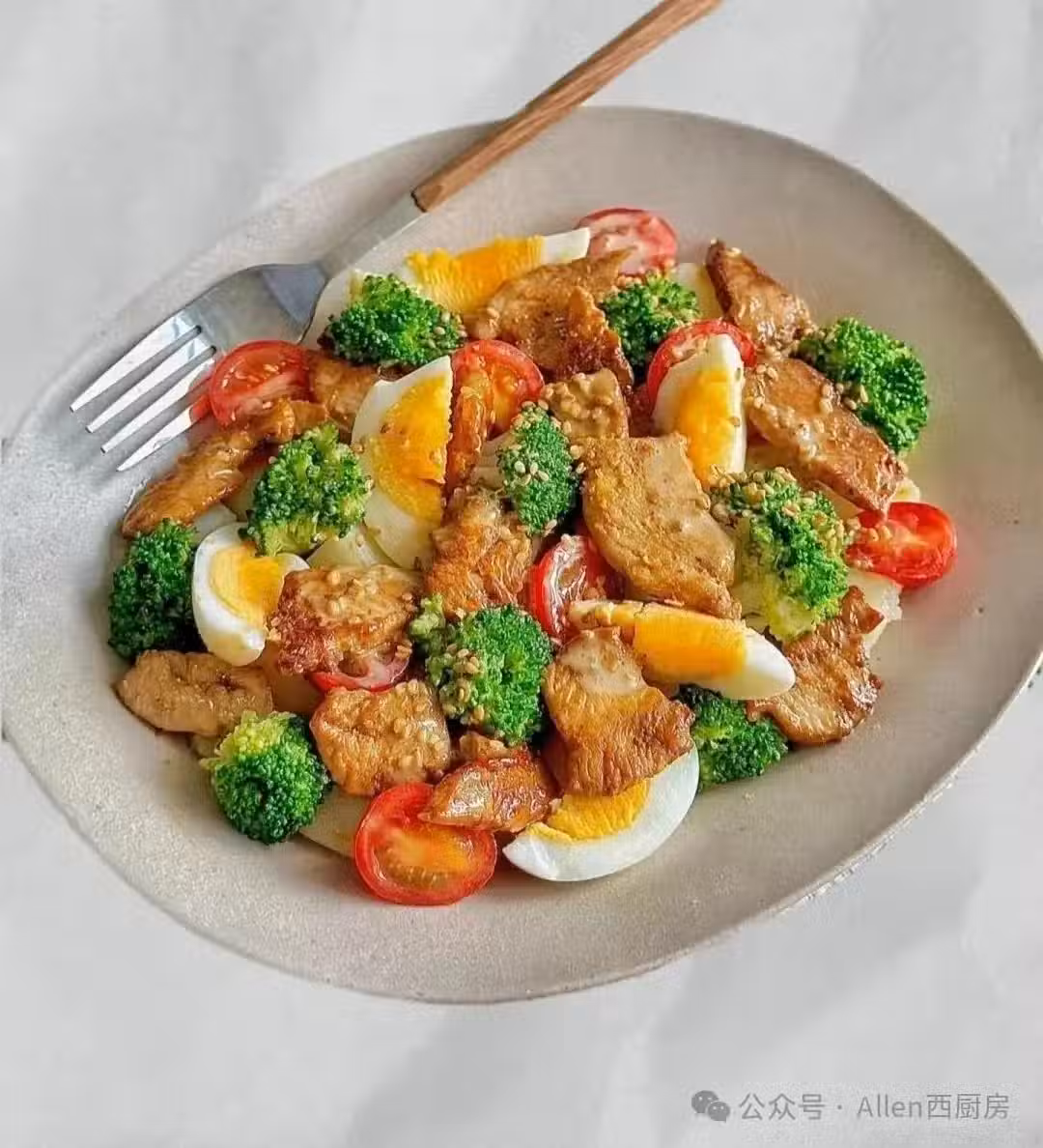 擺盤調味:把小番茄、煮好的土豆塊、西蘭花、煎好的雞胸肉、雞蛋塊擺盤,淋上料汁翻拌均勻。