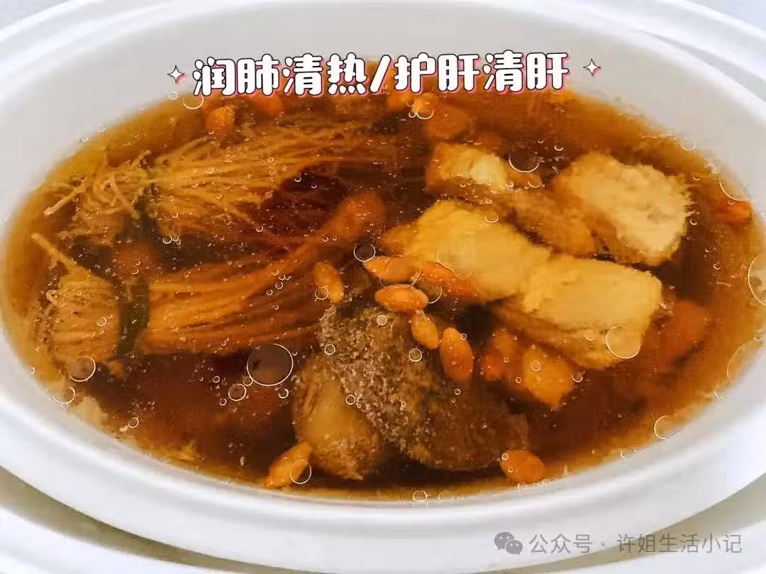 養肝草2扎、西洋參10克、麥冬10克、無花果2顆、枸杞10克、蜜棗1顆、陳皮1瓣、瘦肉