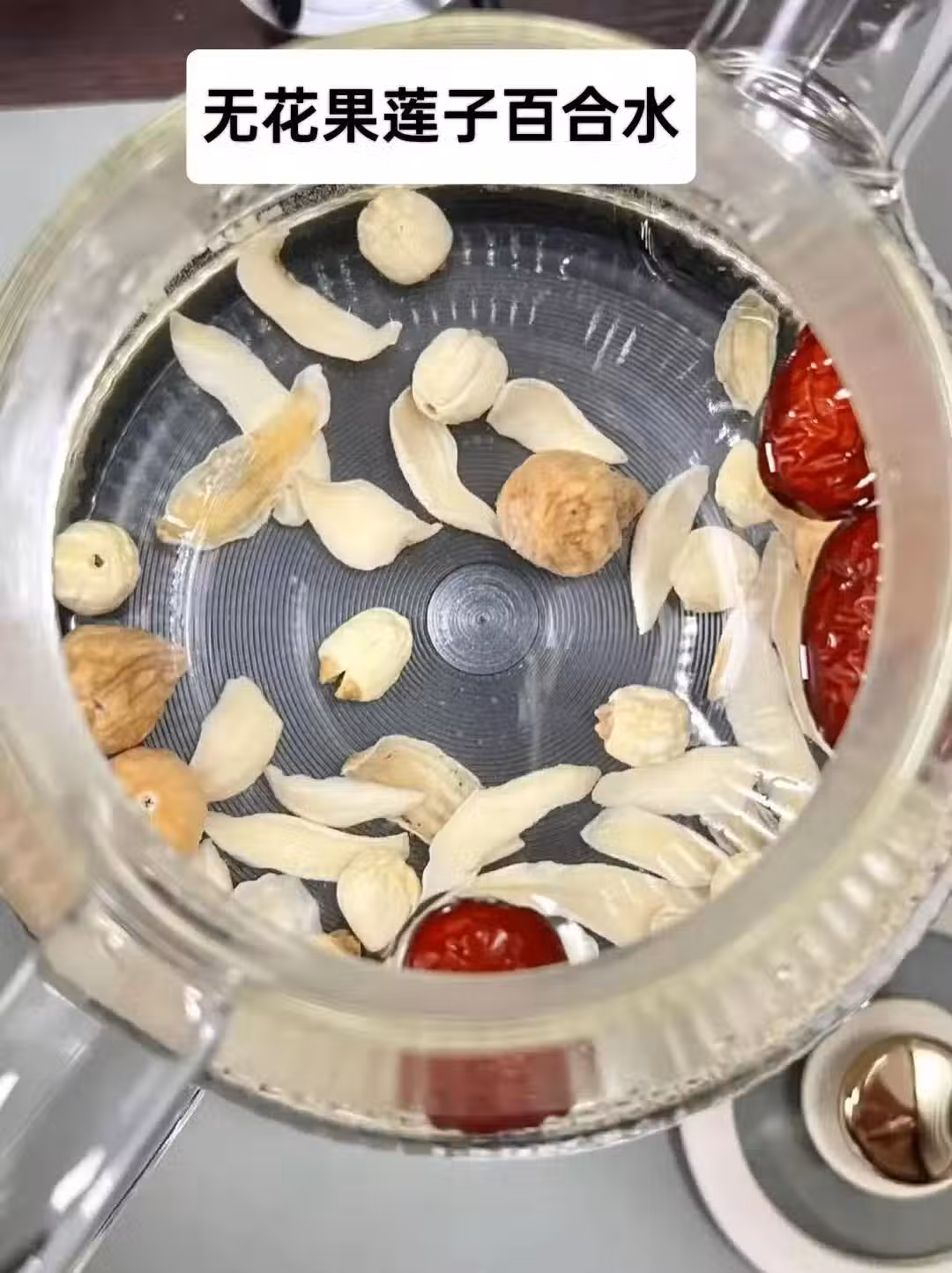 無花果乾4顆,紅棗3顆,蓮子5g,百合5g