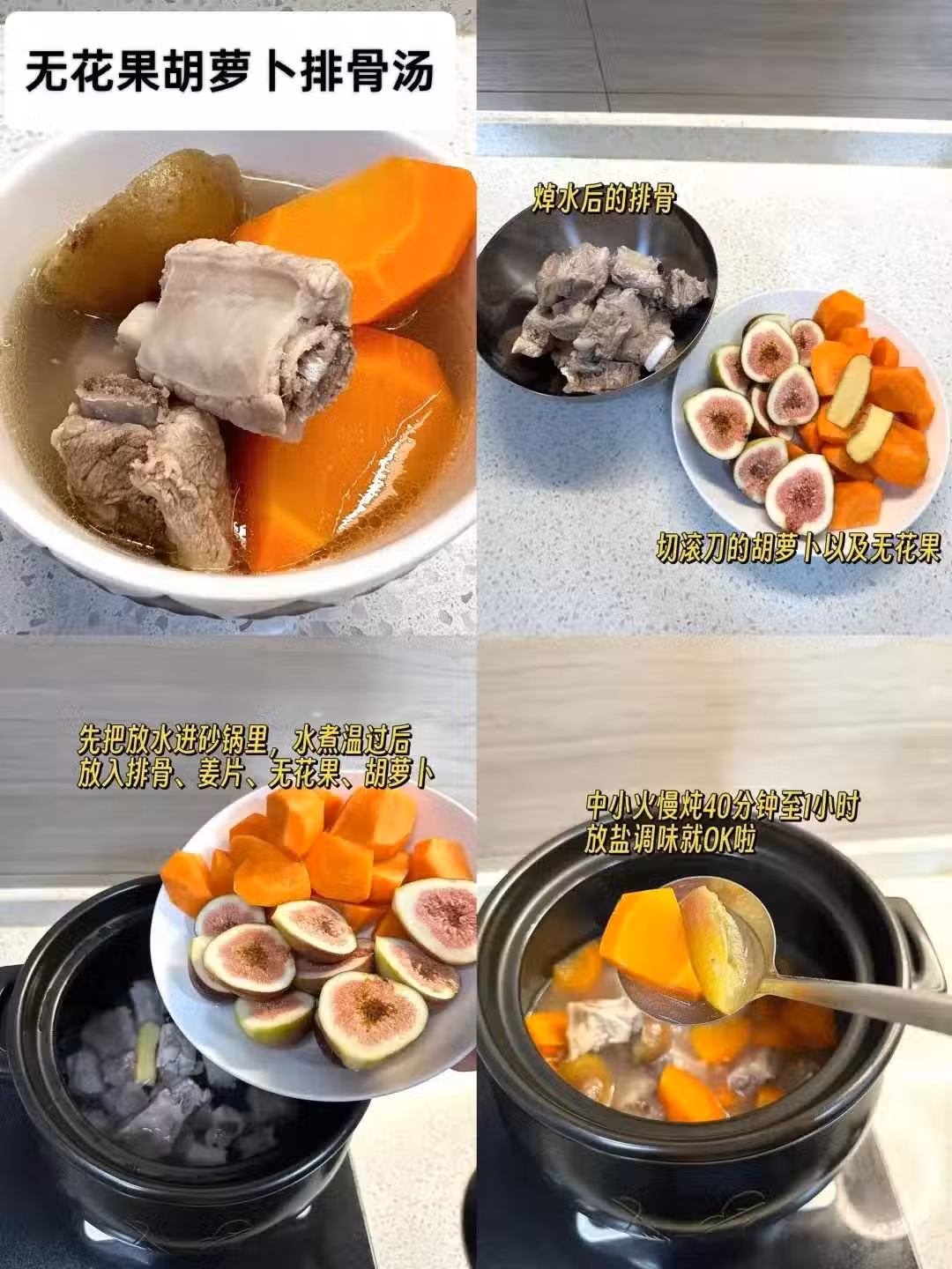 砂鍋中水煮開後放入排骨、薑片、胡蘿蔔和無花果,中小火慢燉1小時,煮至食材軟爛,最後加鹽調味即可。