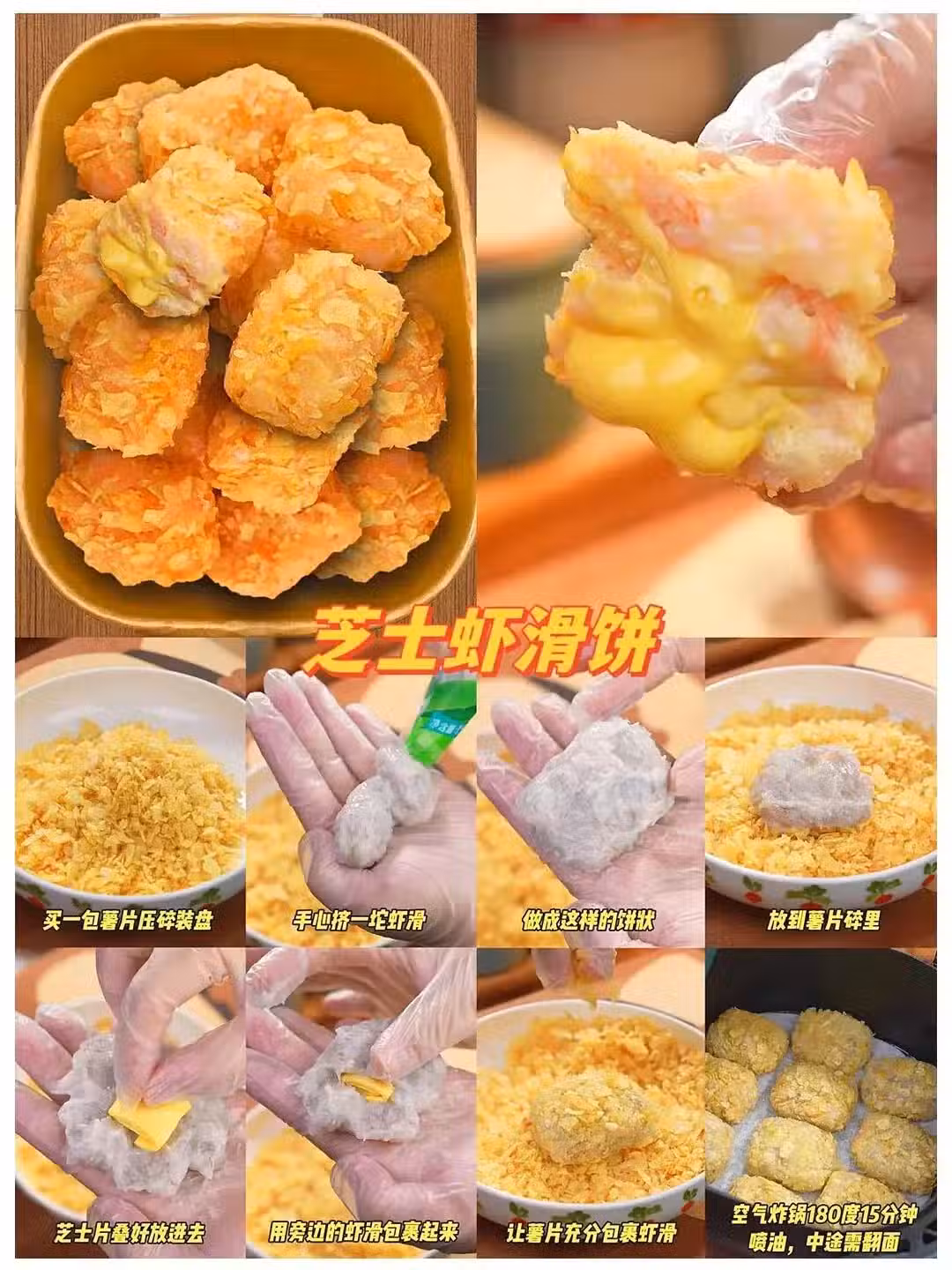 海底撈蝦滑的華麗變身!蝦滑攤成餅將芝士片包裹起來,再裹上薯片碎,烤到能拉出瀑布。建議配泰式甜辣醬,鮮得眉毛打群架!