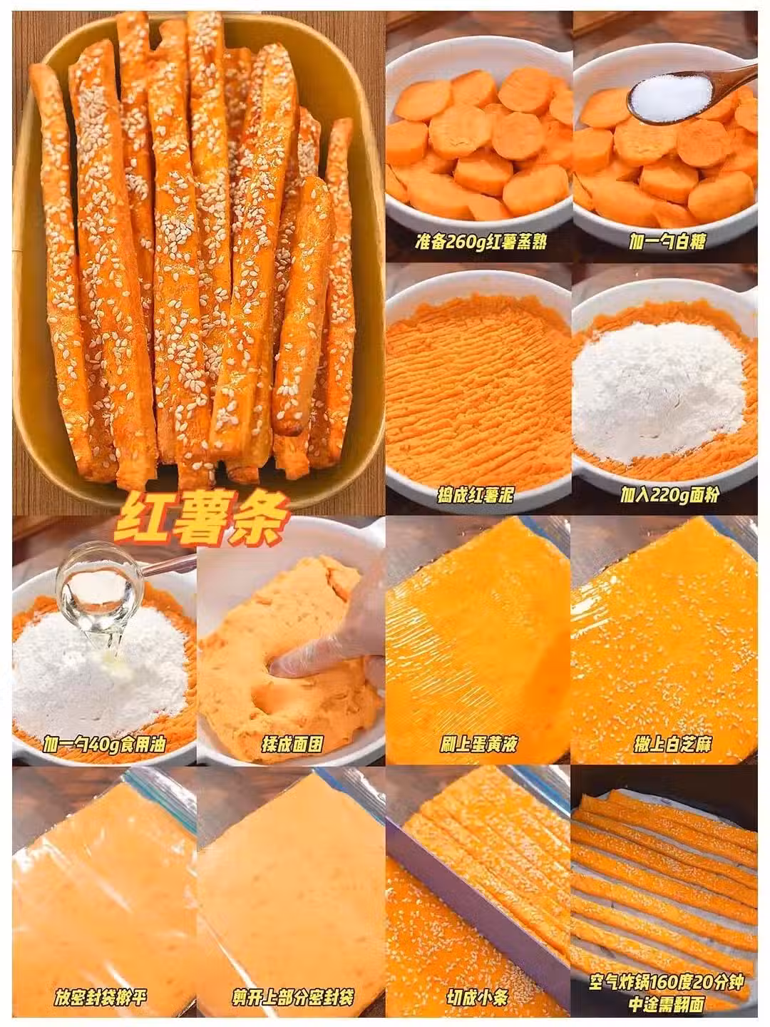 麥麥家薯條在它面前都是弟弟!秘訣是紅薯蒸熟,加麵粉揉成團,再切成小條,撒刷上雞蛋液,撒上白芝麻。