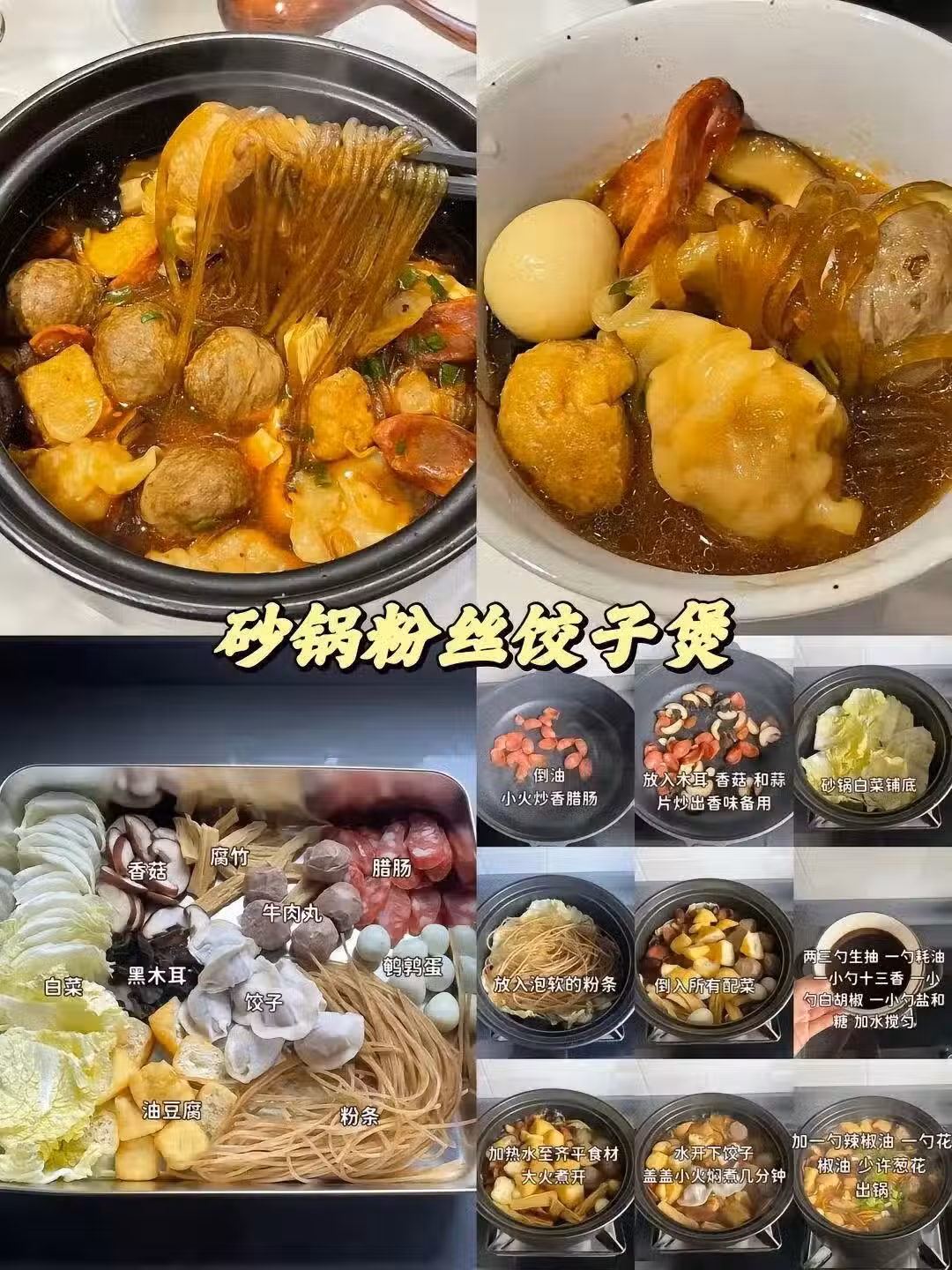 砂鍋粉絲餃子煲真是餃子界「海陸空三棲戰,白菜鋪底,泡軟的粉絲蓋上,再放上所有的配菜,澆勺高湯燜到粉絲吸飽湯汁。