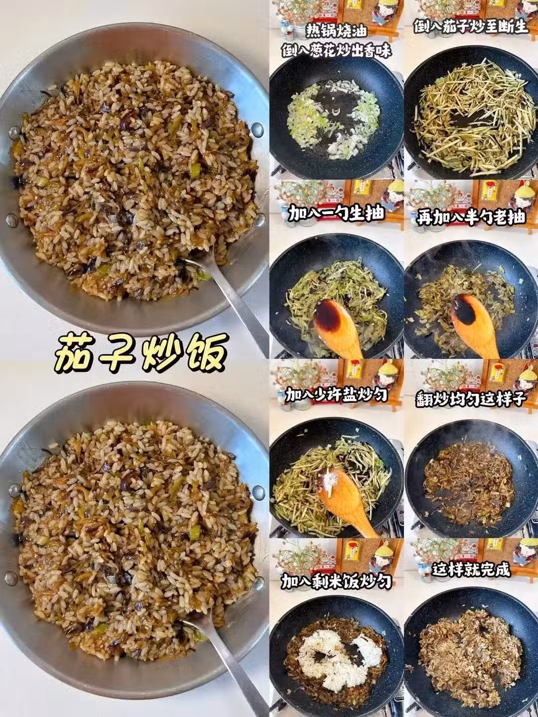 茄子切絲炒斷生,蒜末小米辣爆鍋,茄子懟進去炒到爛糊,和米飯攪和成醬香泥石流。軟糯入味,素食主義者吃了都想喊:「再來瓣兒蒜!」