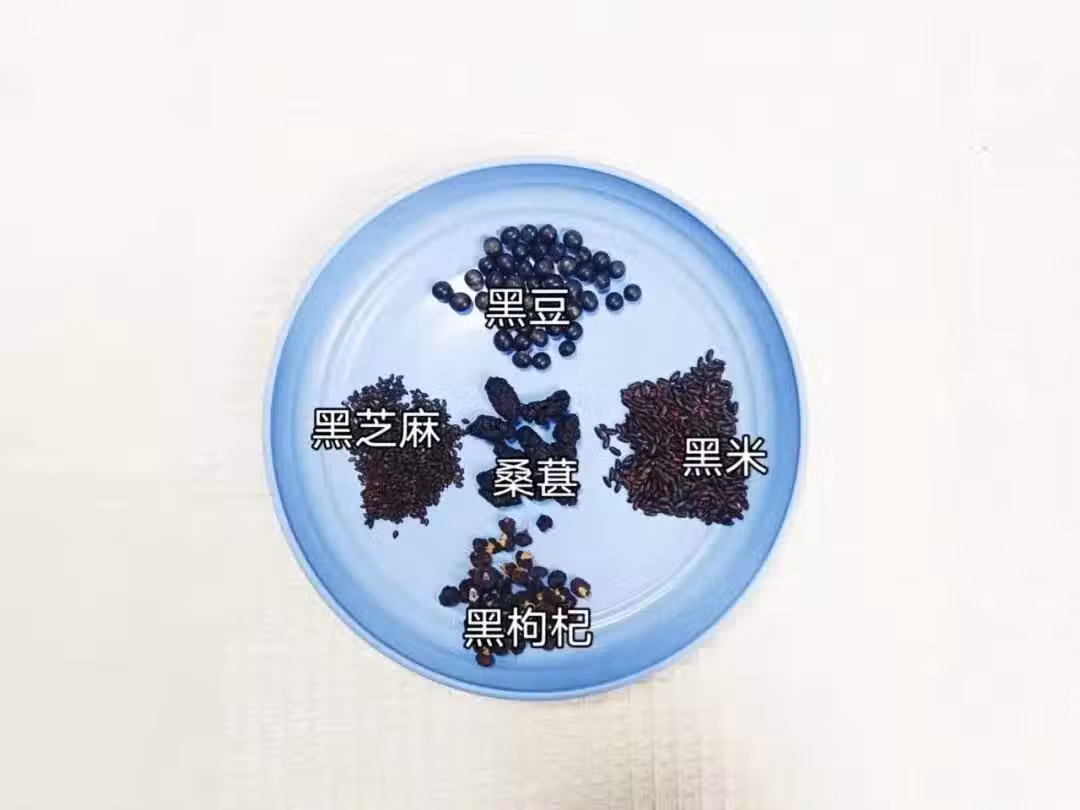 食材:黑豆、黑米、黑枸杞、黑芝麻、桑葚