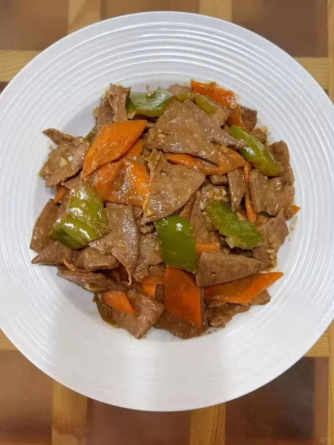 4️⃣ 爆香蒜片,下胡蘿蔔+青椒+雞肝,+1勺醬油+半勺蚝油