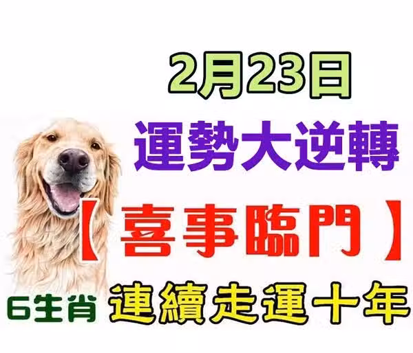 屬狗的人天生機靈,對待朋友比較講義氣,在2月23號生肖狗的朋友將會有神仙助力,此番運勢會帶來比較旺盛的貴人運,橫財也非常多,此時只要稍加把握就能借勢而為,創造一筆驚人的收入,錢包大鼓,家中財運大旺,貴氣逼人。