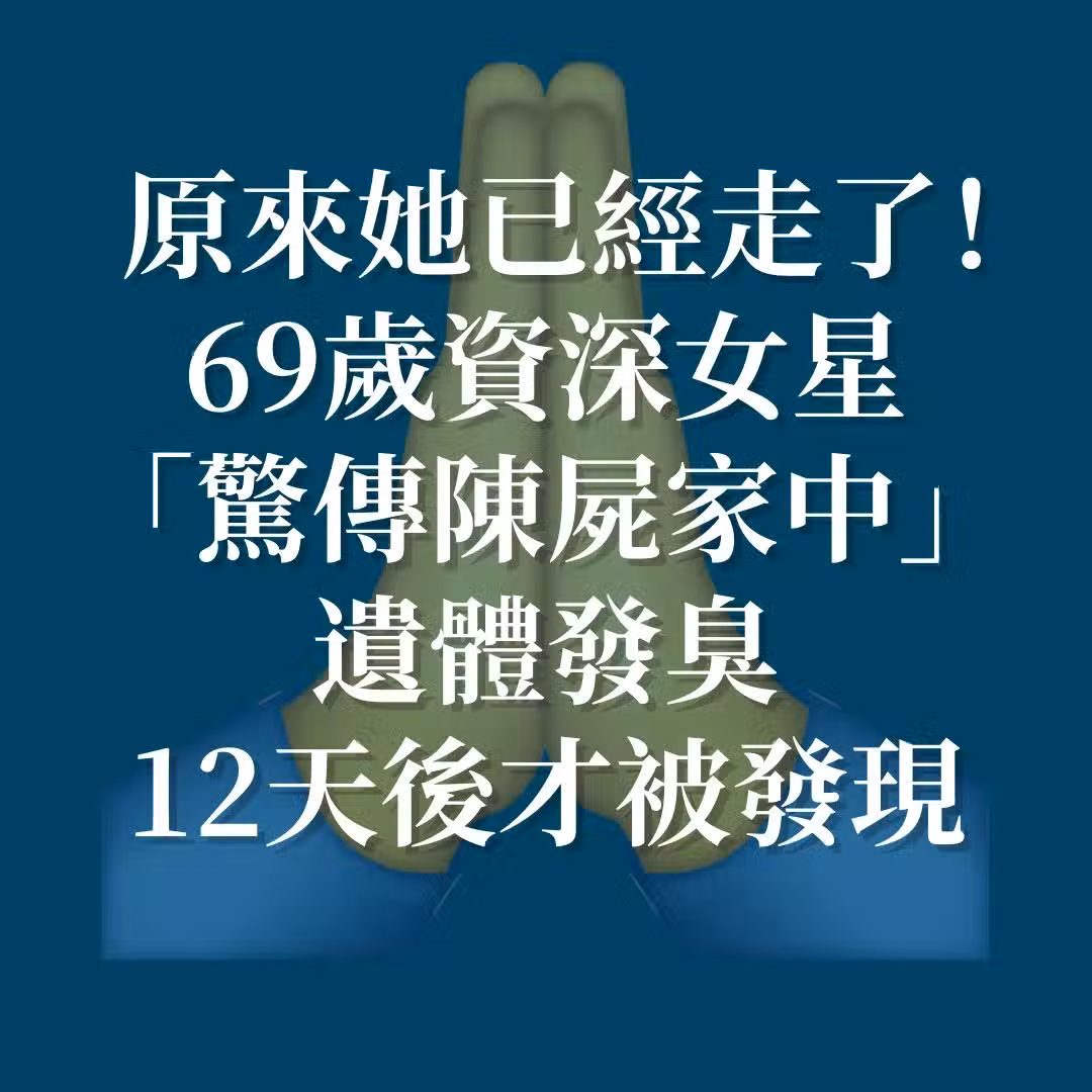 原來她已經走了!69歲資深女星「驚傳陳屍家中」遺體發臭....12天後才被發現