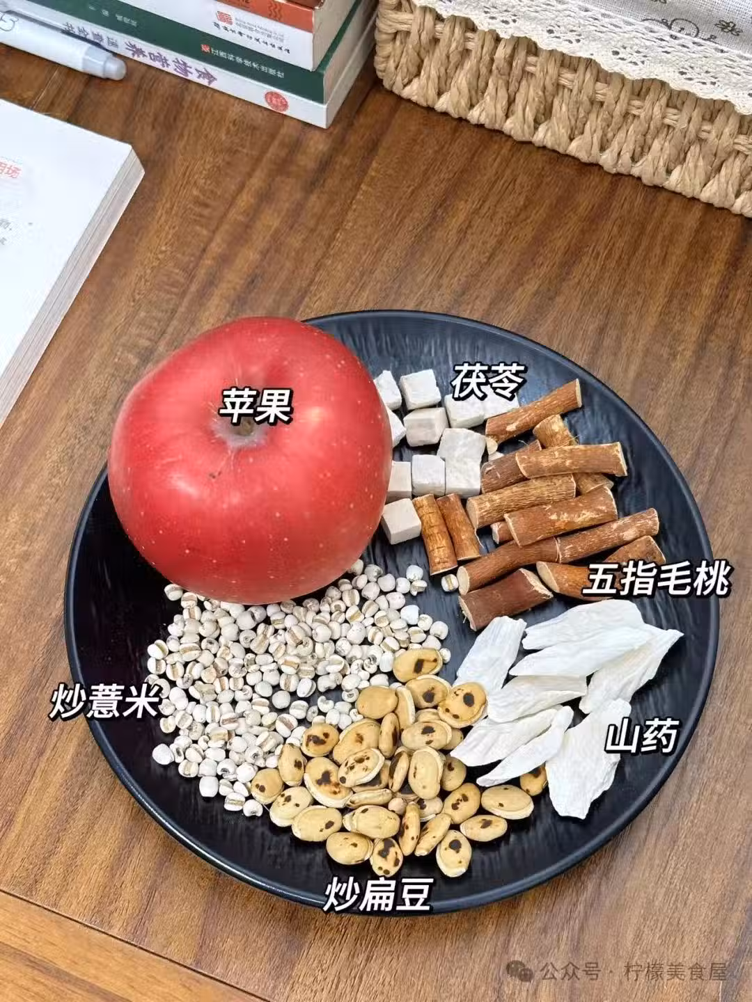 食材:五指毛桃30克、山藥15克、炒薏米20克、茯苓15克、炒白扁豆15克、蘋果一個