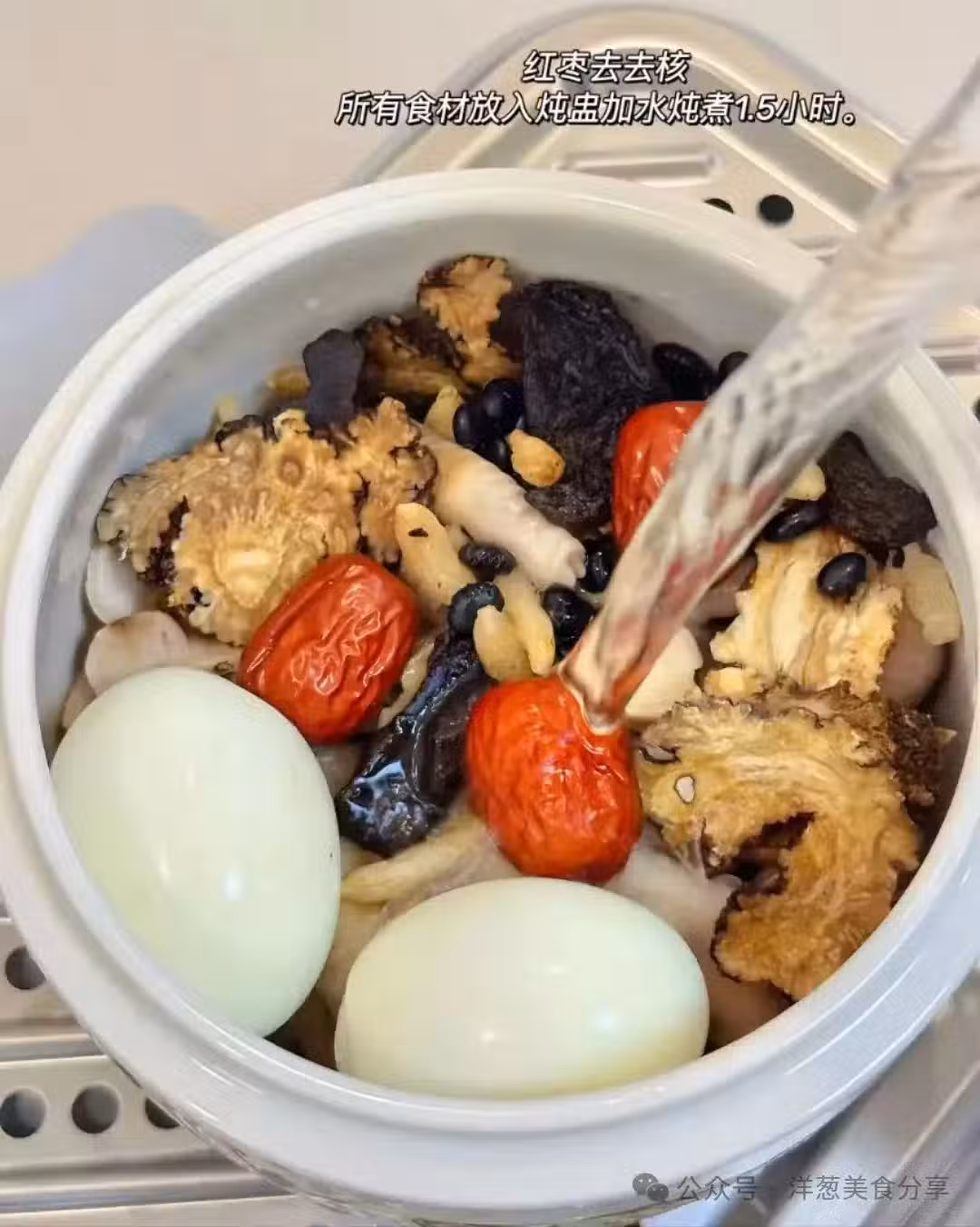 5、所有食材放去燉盅,加水多煮1.5小時