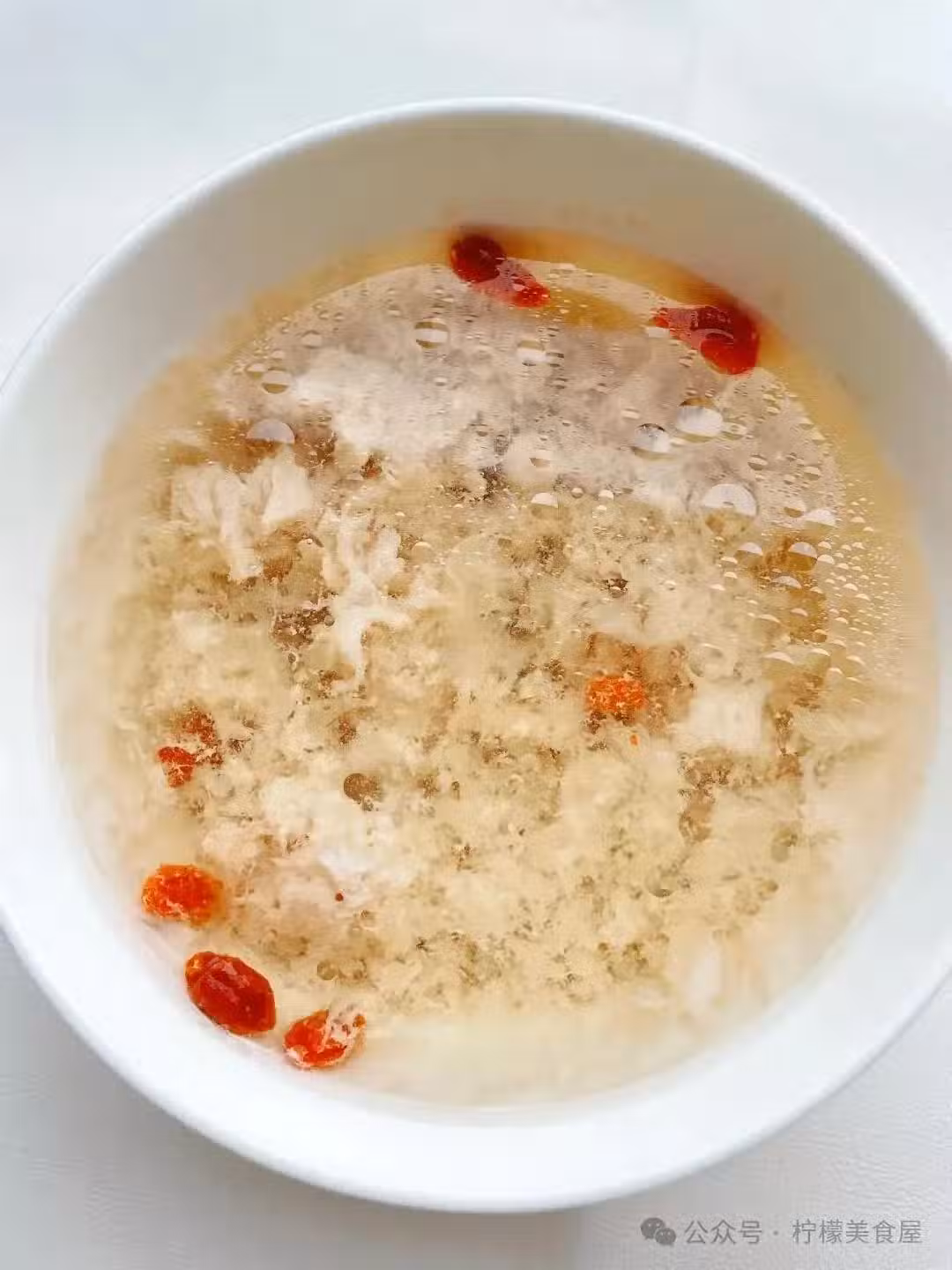 最簡單的做法,只需要一點瘦肉、一點枸杞就可以了,真的太適合小孩子吃了。 不溫不燥,健脾養胃。 食材: 瘦肉、枸杞 做法: 1、買回來的豬肉洗凈剁碎,放到碗里,加溫水泡30分鐘。 2、瘦肉水連碗放到電飯鍋里,煲蒸40分鐘,起鍋放點鹽、枸杞即可。