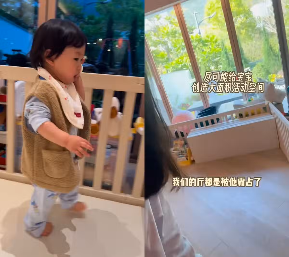 另一段影片則見到袁咕碌在屋內扮講電話,一排落地玻璃窗望到花園位置,袁咕碌則身處客廳,被圍欄及軟墊保護,內里還放有不少兒童圖書及大量玩具。客廳另一邊放有長沙發,側邊有條長走廊通向多間房,但整個客廳都被袁咕碌的物品所霸占,相信是張寶兒為兒子所添置。