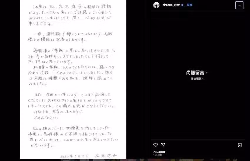 廣末涼子也在14日發表聲明,承認自己與主廚的關係如報導所述,她也為此感到非常抱歉與難過,並已經親口向自己的三個小孩道歉,目前小孩也能理解自己的不成熟。