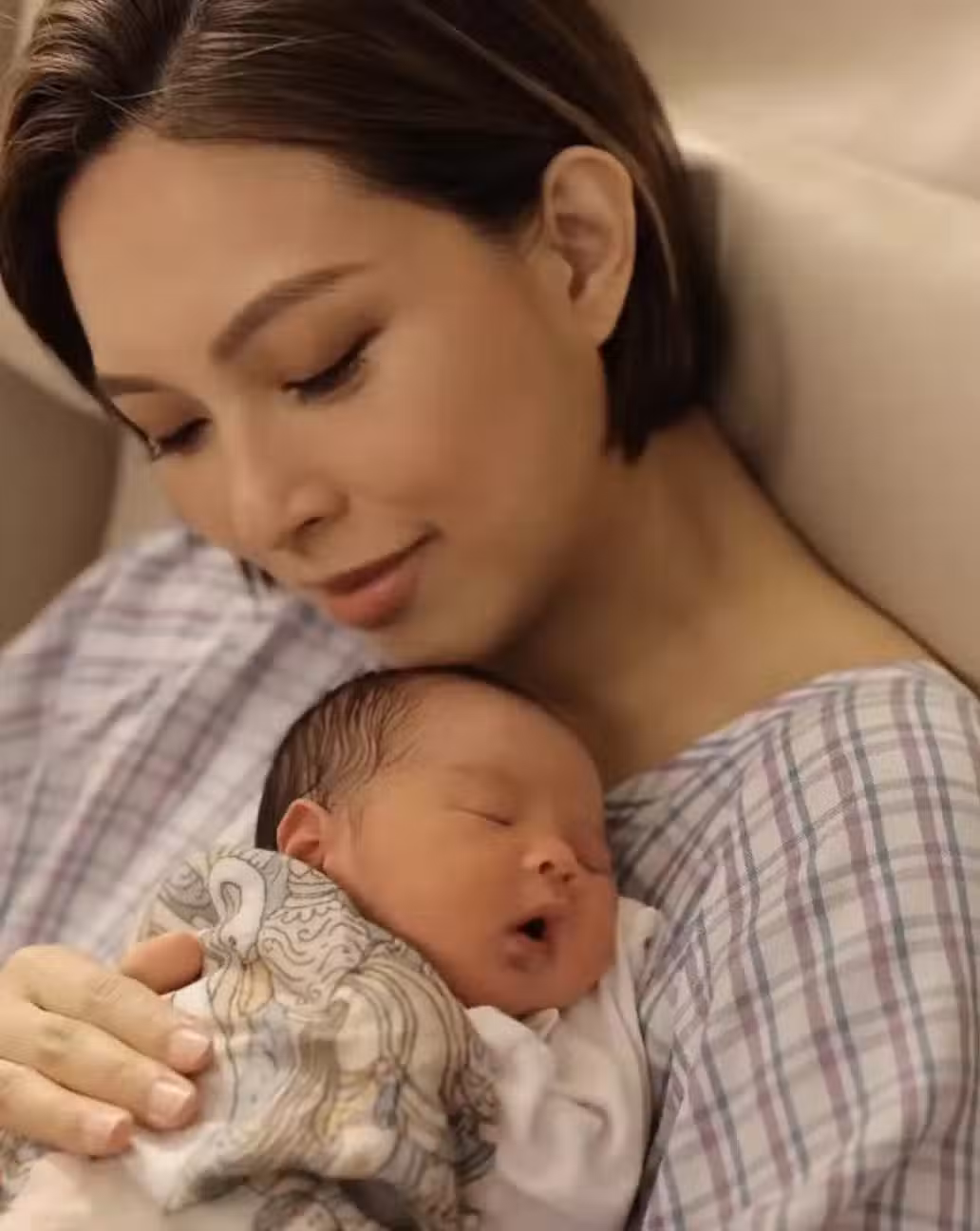 而還沒有出院的朱慧敏依舊在休養中,她穿著睡衣躺在床上,剪了一頭利落的短髮,相信也是為了在坐月子期間可以方便打理,雖然剛生產完沒有多久,但是朱慧敏的狀態非常好,面部也沒有浮腫的痕跡,依舊有稜有角。