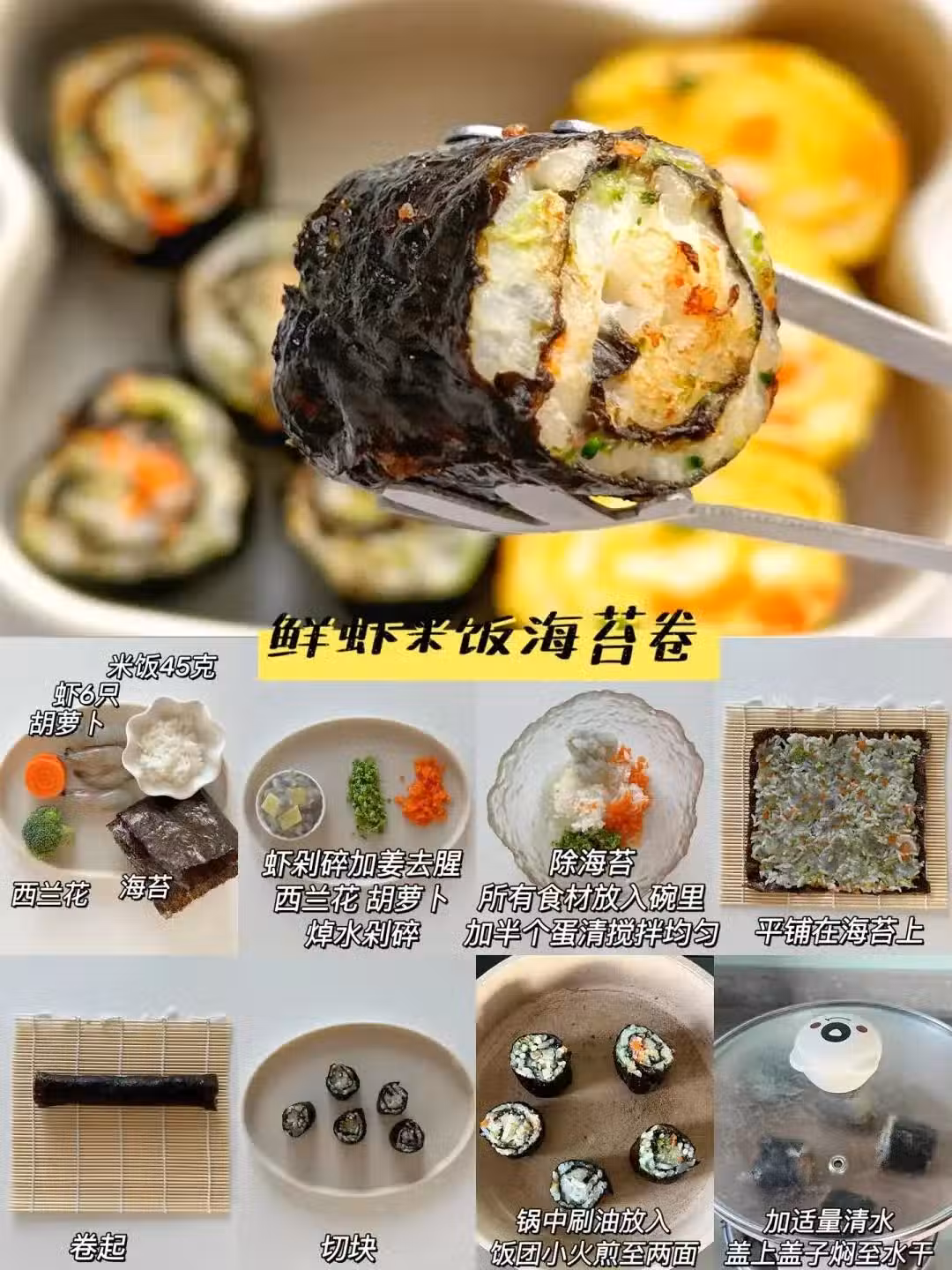 海邊度假的快樂你懂嗎?米飯鋪上海苔,塞進蝦仁碎,卷一卷切段燜熟,蘸點醬油就能吃!