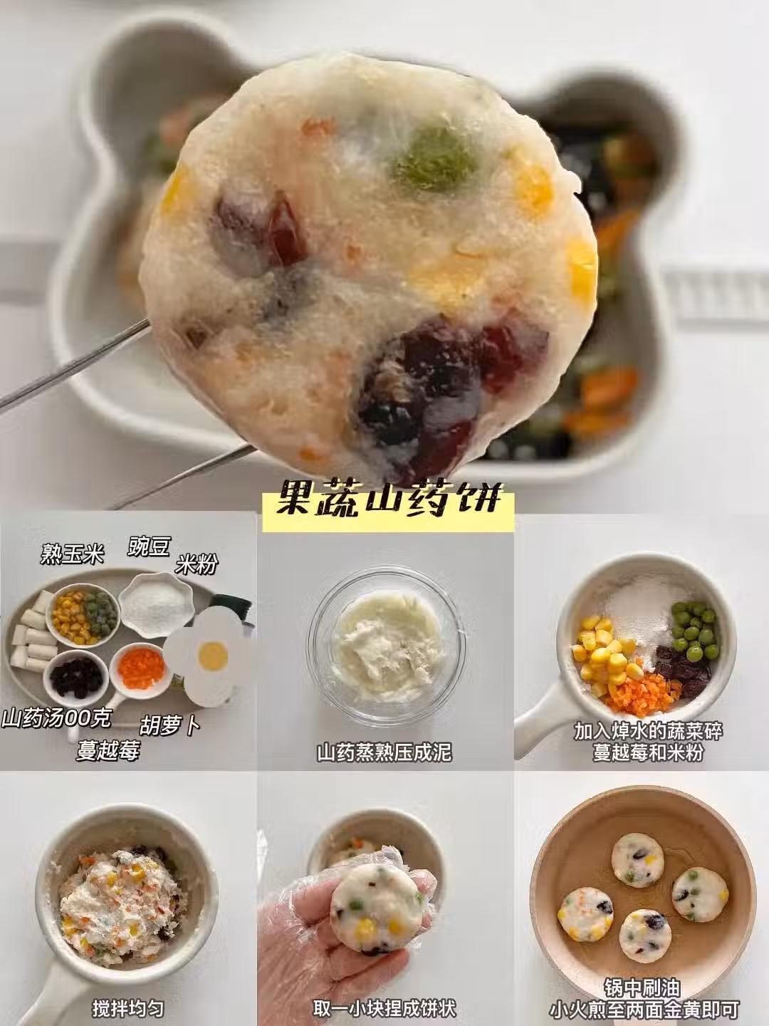 養生黨的偽裝術,山藥蒸熟壓泥,混入苹蔬菜碎蔓越莓和米粉,捏成餅煎到兩面金黃。