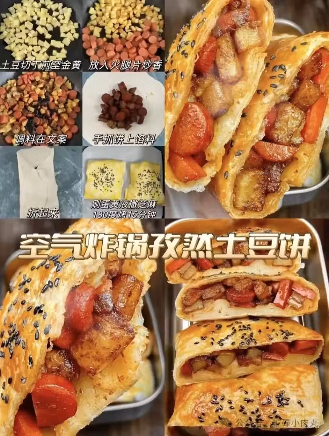 3⃣️早餐新思路,空氣炸鍋三明治安排上! 將雞蛋、培根煎至焦香,搭配生菜、肉鬆、芝士碎,用手抓餅包裹起來 。表面刷蛋液、撒芝士粉,放入空氣炸鍋180度烤20分鐘 。外皮金黃酥脆,內餡豐富又美味,一口咬下去超滿足,為活力滿滿的一天開個好頭!