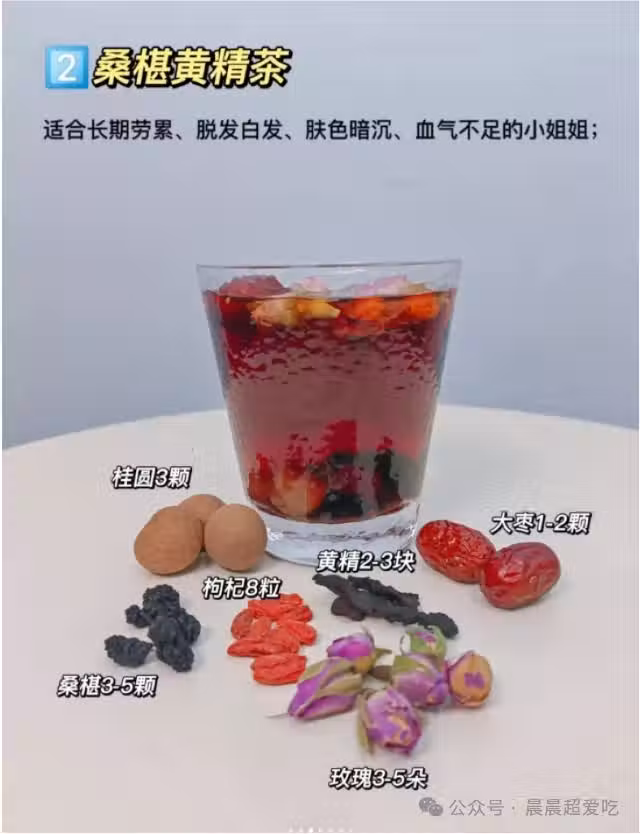 食材:桑葚3-5顆+黃精2-3塊+玫瑰3-5朵+桂圓3顆+紅棗1-2顆+枸杞8粒