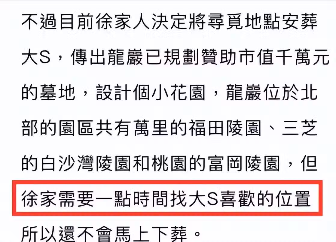 目前徐家人決定另尋安葬地點,傳出龍岩已規劃贊助市值千萬元的墓地,還給出了三個安葬位置,但徐家人似乎對位置不滿意,需要一點時間找大S喜歡的位置,因此下葬時間還要推遲。