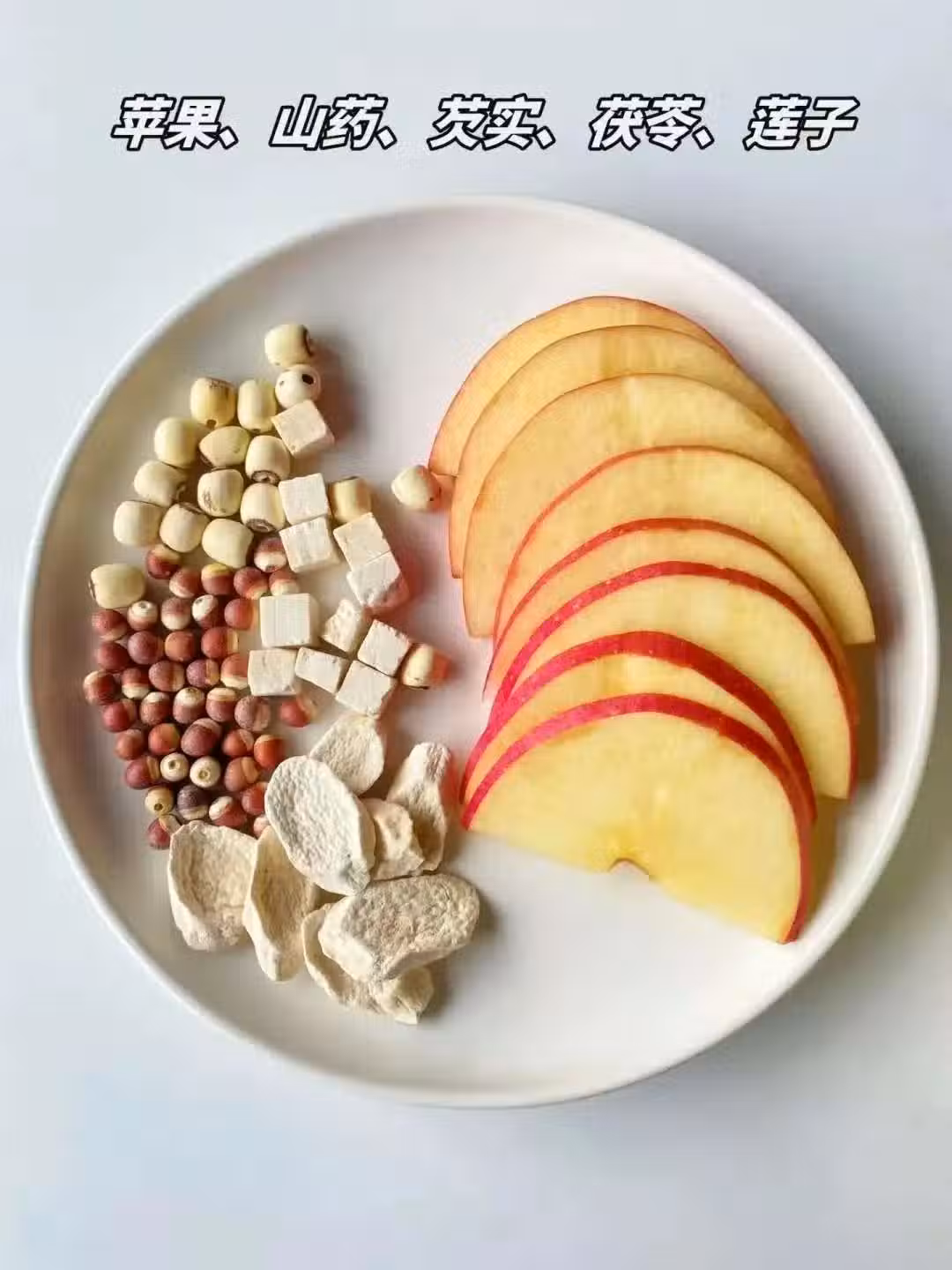 蘋果切片,山藥、芡實、茯苓、蓮子各3克。