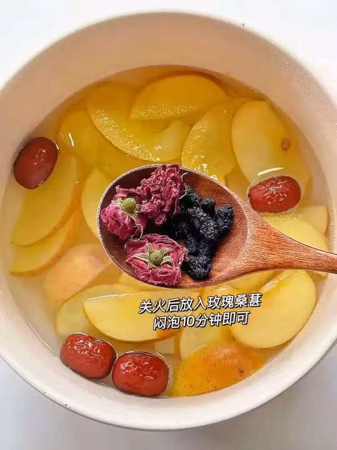 蘋果切片,桑葚、玫瑰、紅棗各3克。
