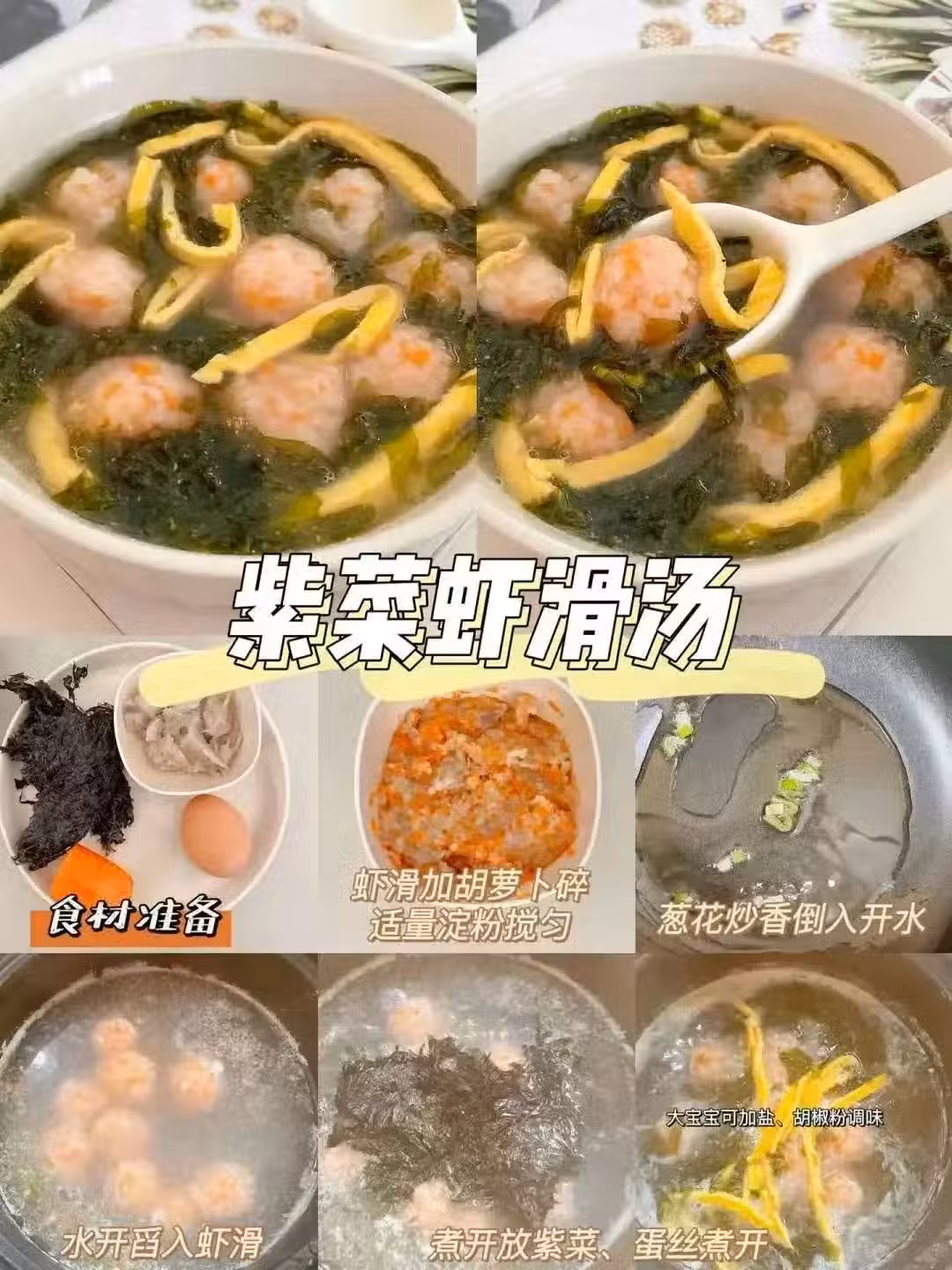 蔥花炒香後倒入開水,水開後舀入蝦滑,煮開放入紫菜、蛋絲。