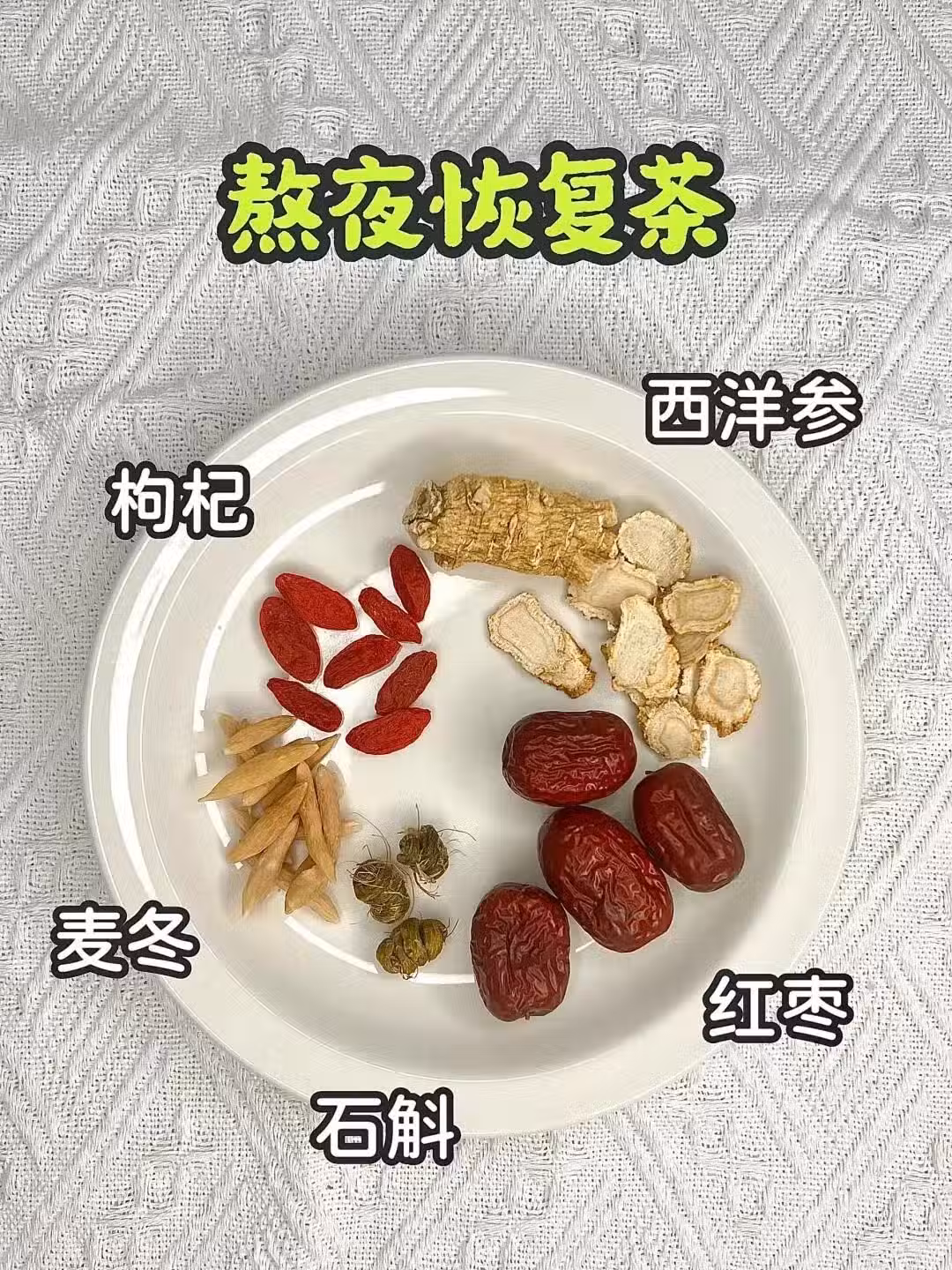 食材:石斛2克、西洋參3克、麥冬6克、枸杞3克、紅棗片5克