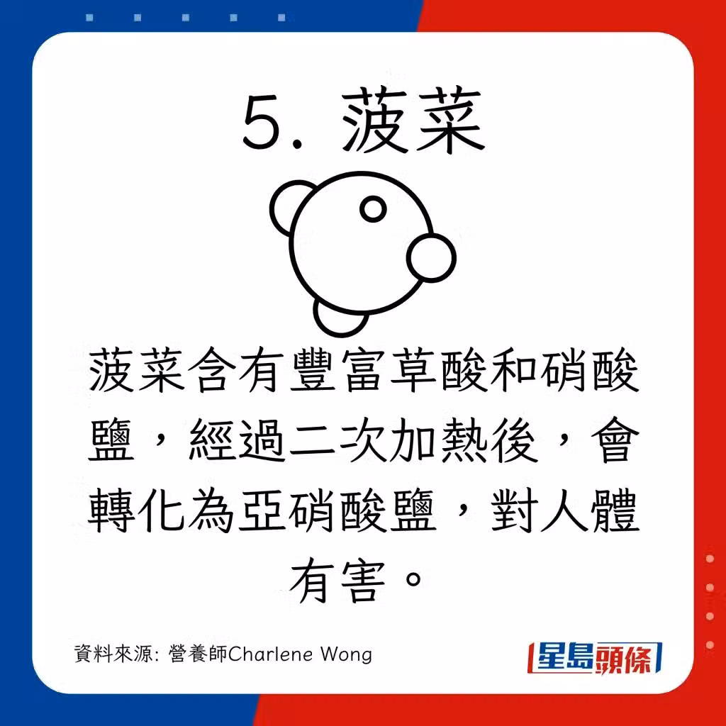 含豐富草酸和硝酸鹽,經過二次加熱後,會將其轉化為亞硝酸鹽,有害健康,不宜食用。
