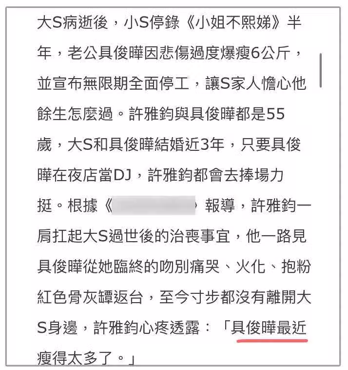 此前,大S好友賈永婕便透露,具俊曄的肌肉都消失了,目測他瘦了12斤。