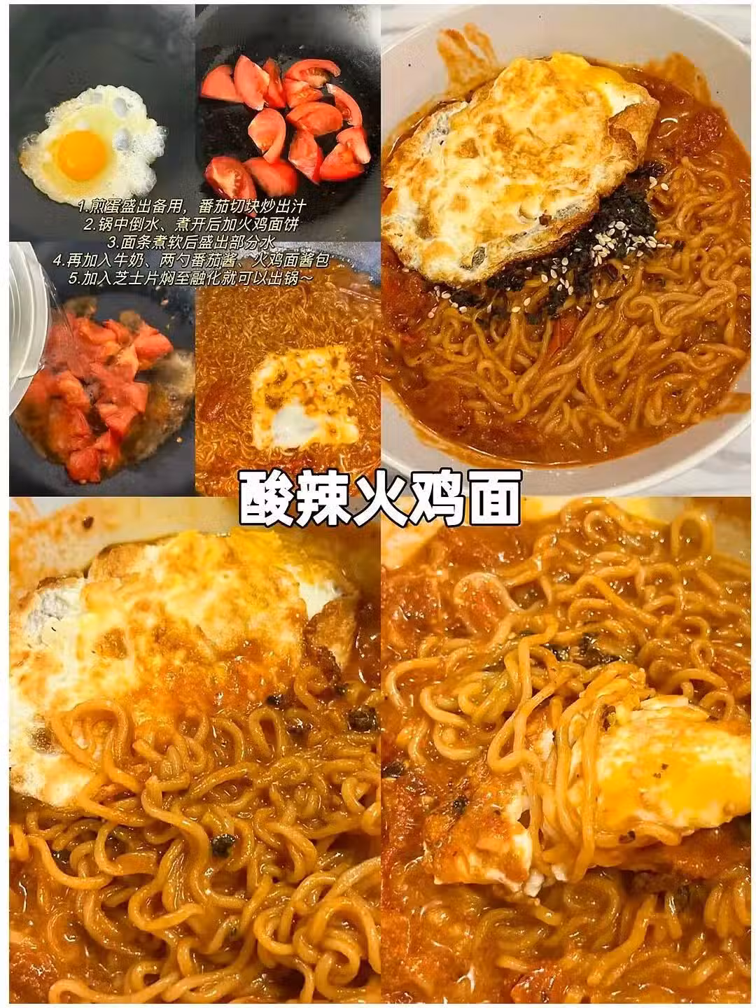 靈感來源:番茄湯底和火雞面的靈魂共鳴。 做法:番茄切塊炒出汁,牛奶芝士搞裡面,最後再加一個靈魂煎蛋,完美~ 口感:酸酸辣辣,邊流淚邊喊「再來一口」! 牛奶芝士烤腸火雞面