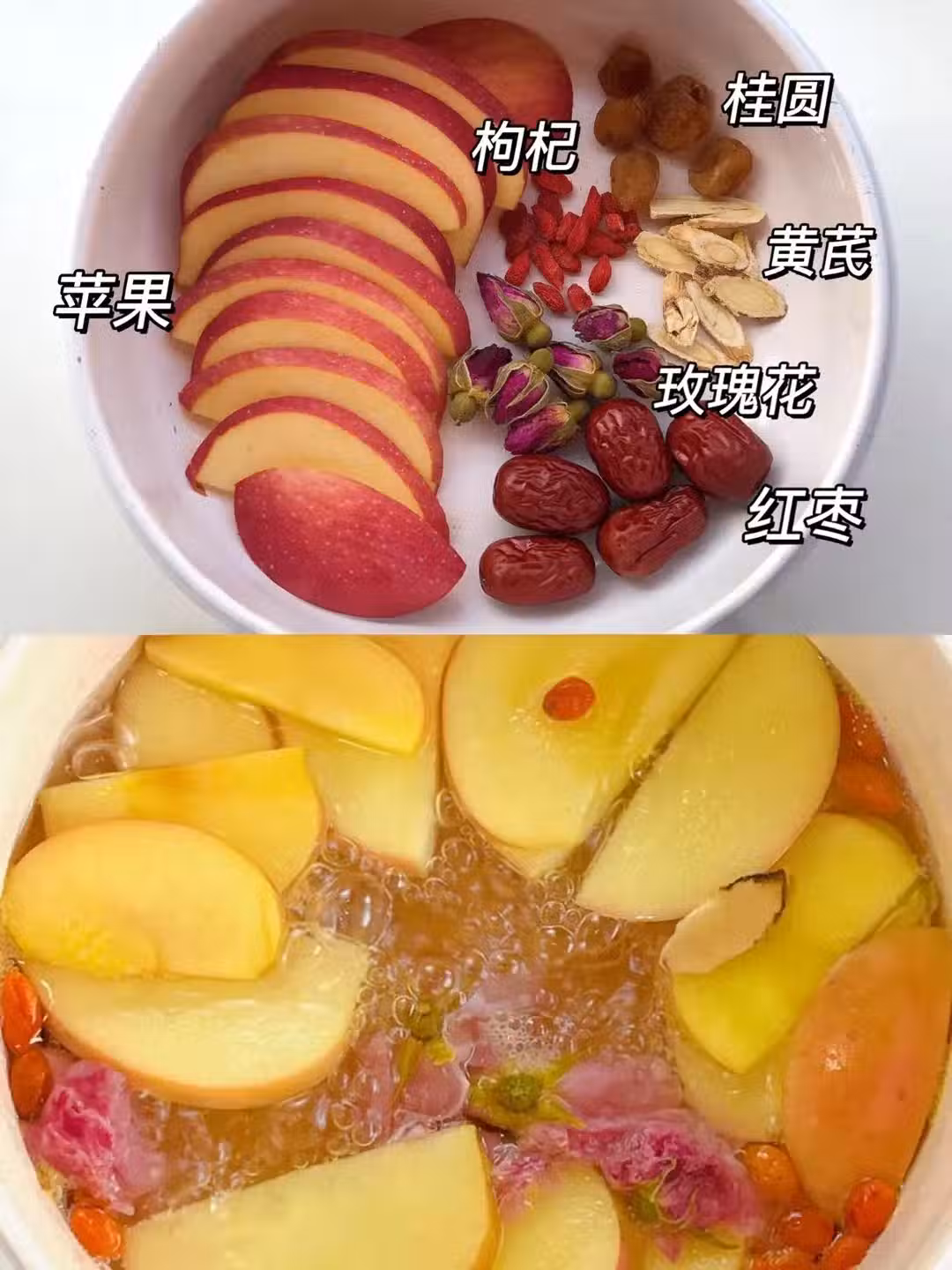 四、蘋果桑葚桂圓水 桑葚含花青素,搭配蘋果抗氧化,適合長期用眼、熬夜人群 食材:蘋果半個、桑葚干15克、桂圓肉10克、枸杞5克、玫瑰花5g、紅棗5顆 做法:所有食材加800毫升水,煮開後小火15分鐘 飲用建議:隔日飲用一次,建議上午喝