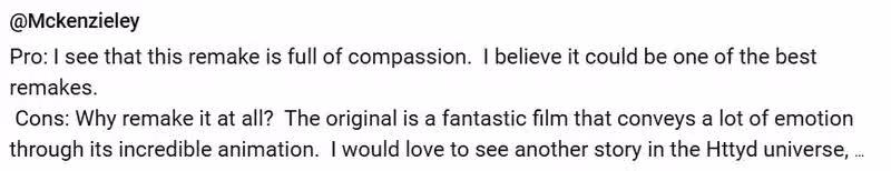 「就一個問題:為什麼要重製?應該拍個新的好看的《馴龍高手》故事而不是把舊的重拍一次,既然都有動畫版了為什麼還會有人想看真人版?」