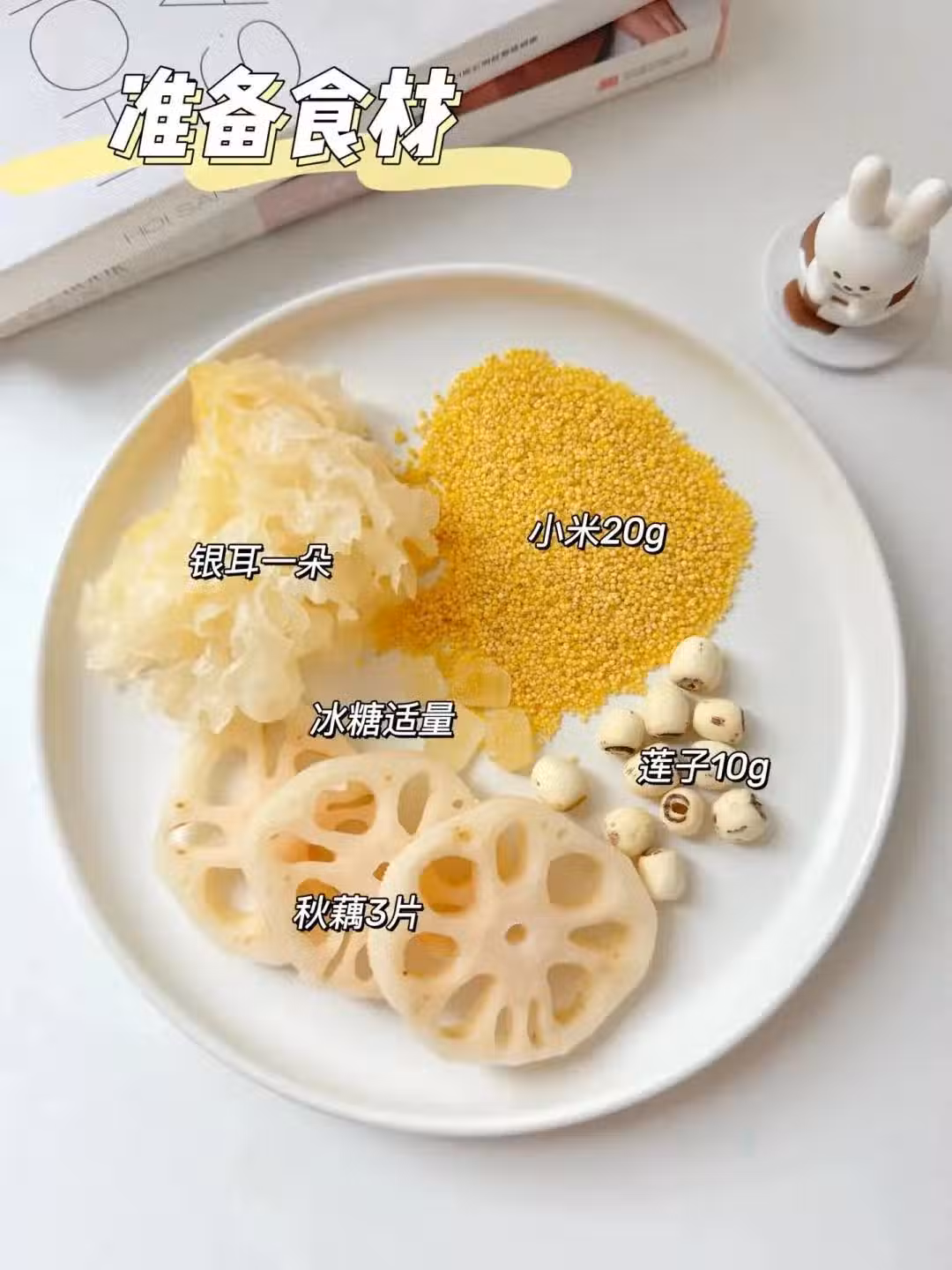 銀耳50g,小米20g,蓮子10g,蓮藕3片,冰糖適量