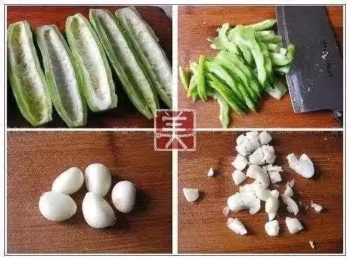 首先將苦瓜挖去子,切薄片。然將蒜拍扁,再熱鍋,放油,爆香蒜頭。