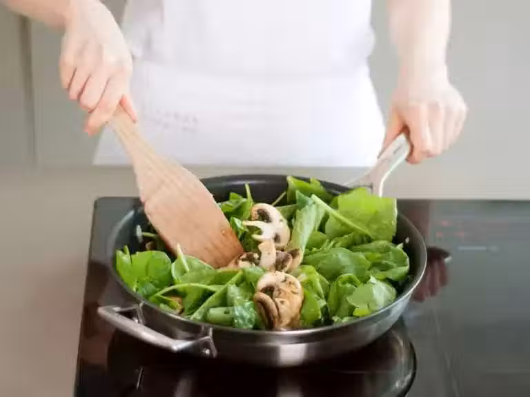往煎鍋中倒入橄欖油,加入蘑菇和百里香,繼續翻炒幾分鐘,至蘑菇開始變棕色。如有需要,可多倒些油。加入菠菜,炒至菠菜萎軟,需不時翻攪。加鹽與胡椒調味。關火,置於一旁備用。