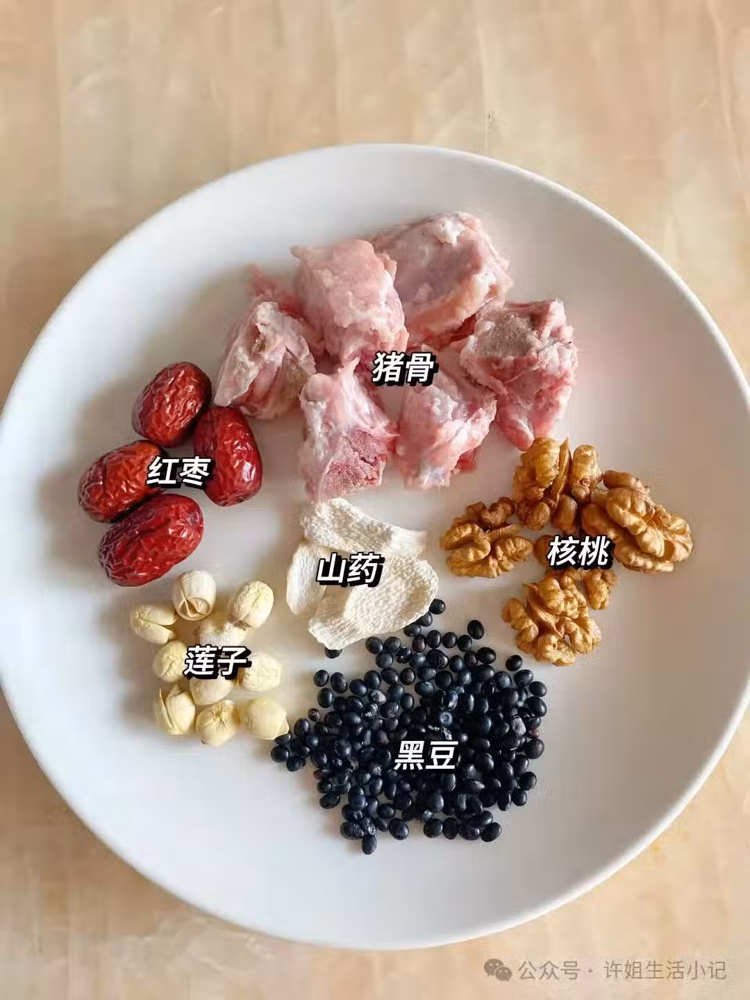 食材:豬骨500克、核桃6-7個、紅棗4-5個、蓮子15克、黑豆30克、山藥10克