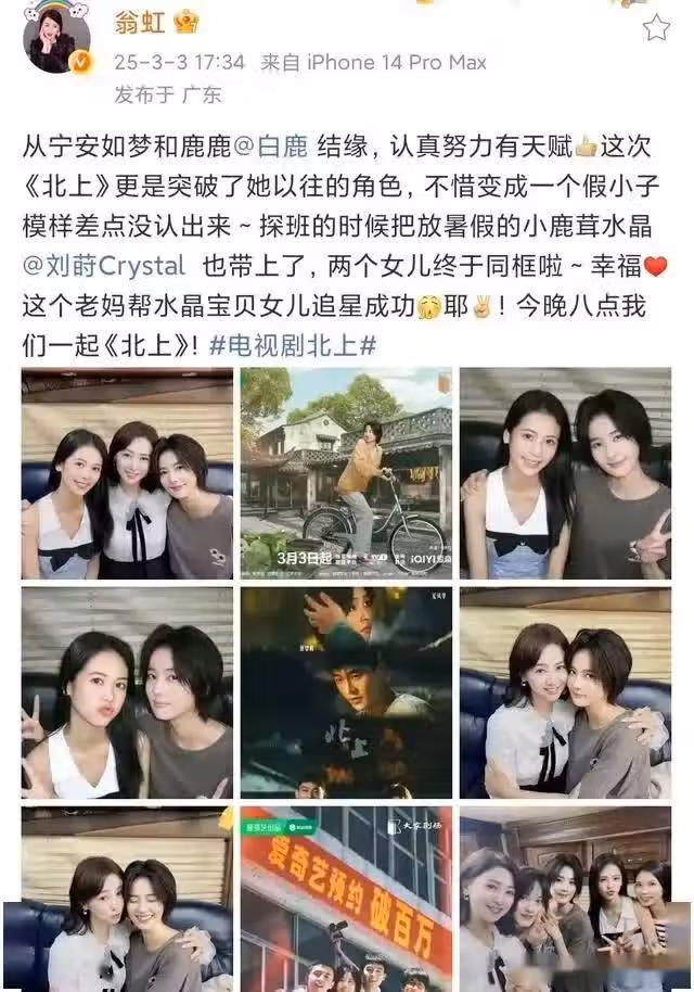 白鹿的新劇即將和觀眾見面,演員們到了作品播出的階段,也是考驗圈內人緣的時候,在《寧安如夢》里飾演母親的翁虹就出來專門為白鹿發了一條博文,還曬出探班9宮格為白鹿助陣宣傳,拍戲時期的交情到了現實中依然很受用。