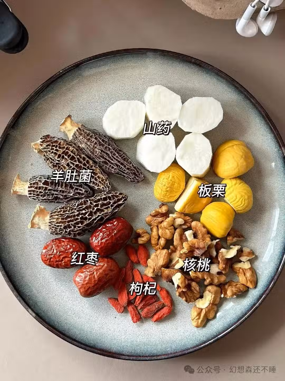 生板栗5顆、生核桃三顆、新鮮山藥半根、羊肚菌四顆、紅棗三顆、枸杞一小把、排骨半斤