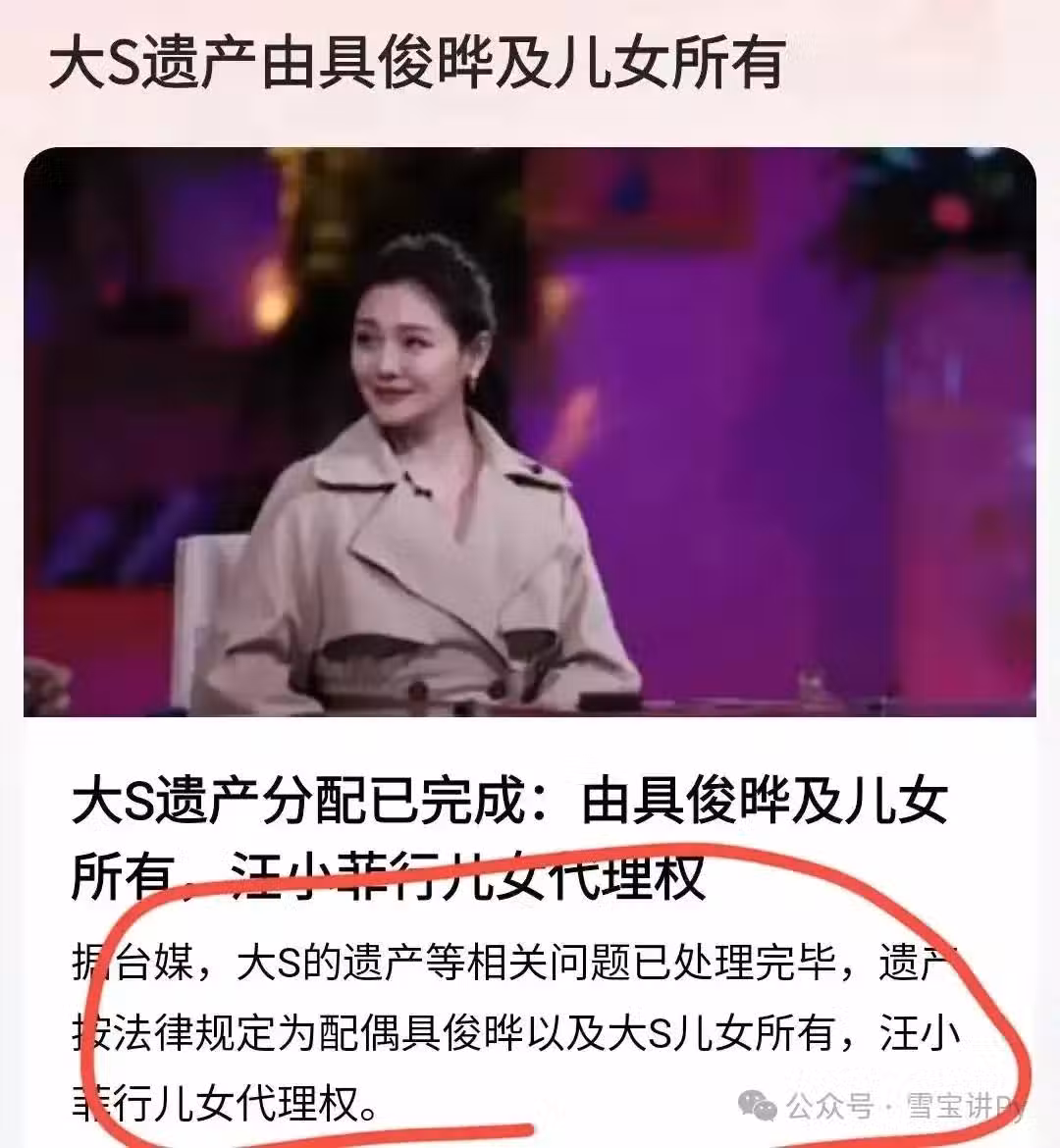 「這瓜保熟嗎?」 最近娛樂圈最炸的新聞,非大S身後事莫屬!據台媒最新爆料,大S留下的近6.5億新台幣(約合人民幣1.5億元)遺產分配終於塵埃落定。配偶具俊曄已正式繼承遺產,並放話要「全數轉交S媽」,但現實卻暗藏法律關卡。另一邊,前夫汪小菲被曝手握子女財產代理權,帶新妻馬筱梅現身台北寺廟,一家三口互動溫馨。這場豪門遺產大戲,真能如表面般和諧收場嗎?