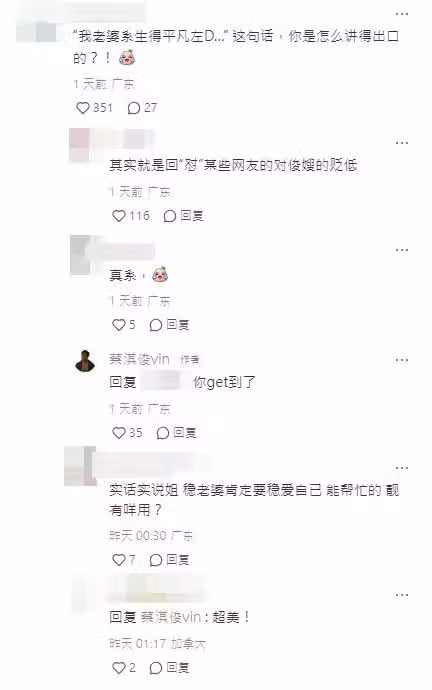 本來是蔡淇俊對老婆表達愛意的視頻,但很多網民卻批評:「我老婆是生得平凡了些... 這句話,你是怎麼講得出口?!」其他網民則回覆:「就是,其實阿俊老婆生得好靚」、「一開頭這句話後,後面再多讚美的話我都覺得假...」